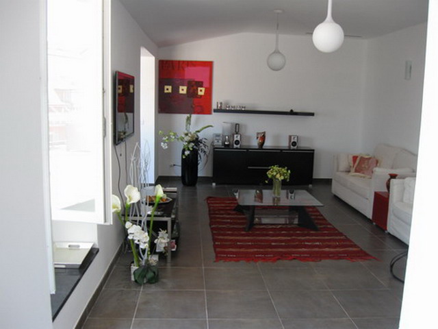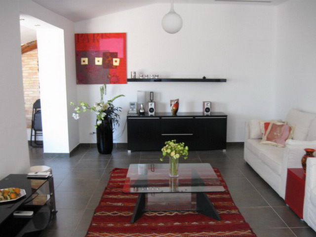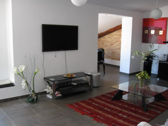 Гостиная декорирована со вкусом, есть большой телевизор с плоским экраном.
